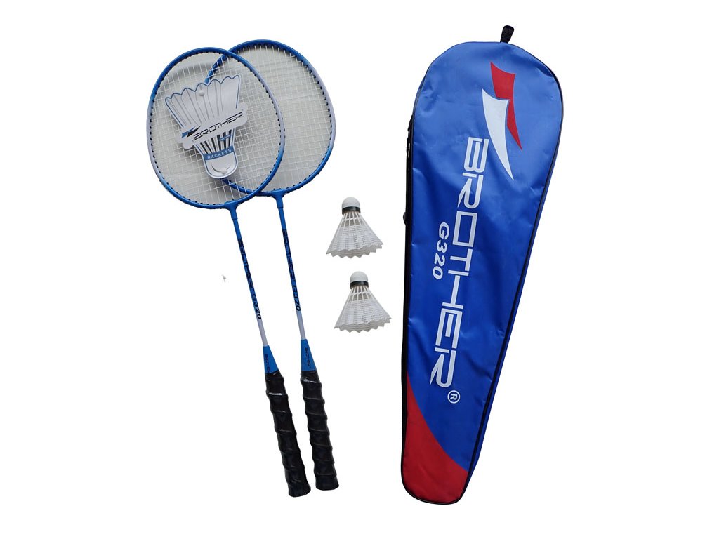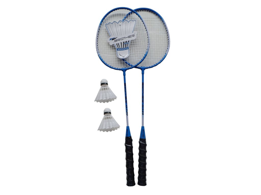 Dvě ocelové pálky s plastovými průchodkami pro ochranu výpletu, pevný výplet, plastový košíček jako součást badmintonové sady, pouzdro přes rameno, určeno pro rekreační hru.