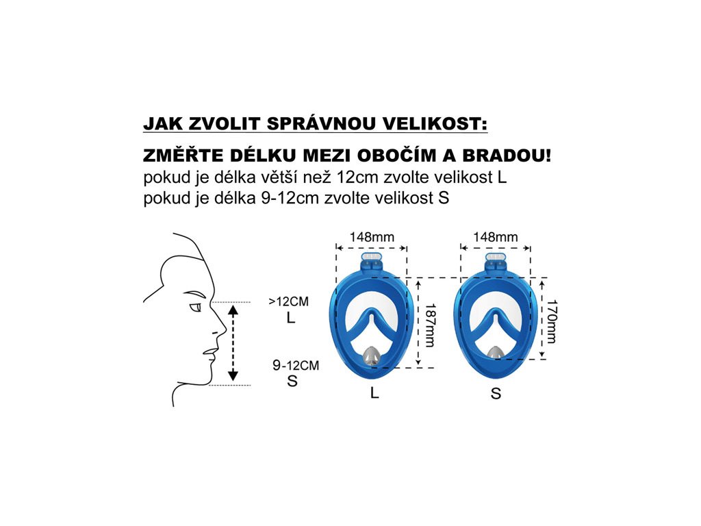 Materiál silikon + tvrzené sklo. Perfektně padnoucí upínací systém složený ze dvou nastavitelných gumových pásků, které netahají za vlasy, umožňuje dokonalé držení masky na obličeji. Velikost L je vhodná pro juniory a pro dospělé včetně žen s větším obličejem. Je možné si ověřit vhodnost masky změřením vzdálenosti od kořene nosu po bradu. Velikost L je vhodná při délce nad 12 cm. Měření velikosti se provádí mimo nos, pouze jako přímá vzdálenost brady a kořene nosu. Potápění je doporučeno pouze do jednoho metru pod hladinu. Ve větších hloubkách může dojít k tlaku vody na masku, a tím i nepříjemnému tlaku na obličej.