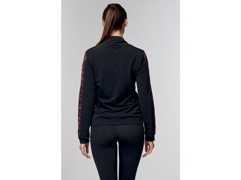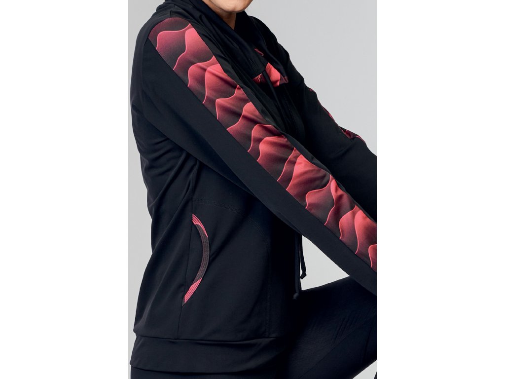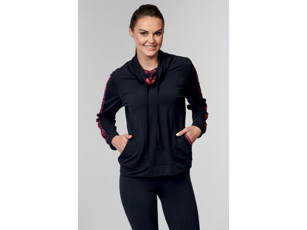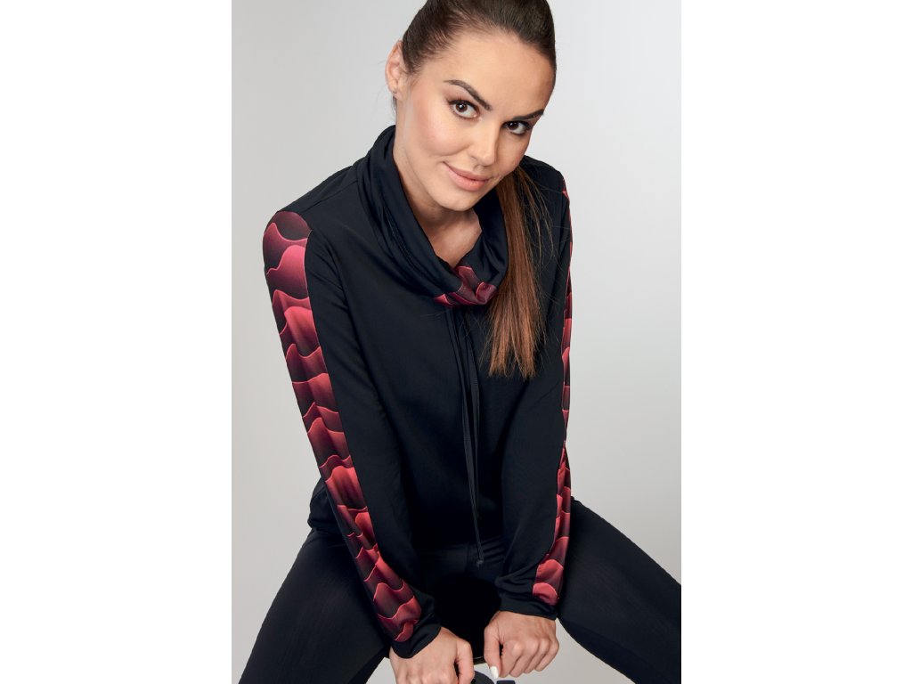 Sportovní nepropínací dámská mikina s větším stojacím límcem a kapsami ve švu. Mikina je ozdobená kontrastním pruhem v límci, na rukávech a kontrastním olemováním kapes. Rukávy i délku má zakončenou do manžety a je vyrobená z příjemného materiálu Colorado techno-pleteniny v polyamidovém mikroprocesorovém efektu s teflonem a jemným počesem. Látka je extrémně měkká a nadýchaná, chrání před UV paprsky s faktorem 50+ a obléká se jako druhá kůže a jemně doprovází každé sportovní gesto. Ideální pro výrobu oděvů pro volný čas a sportovní oblečení.