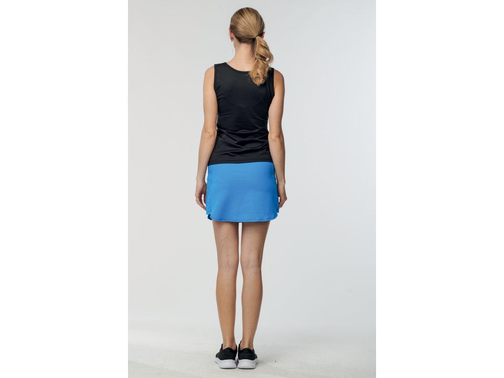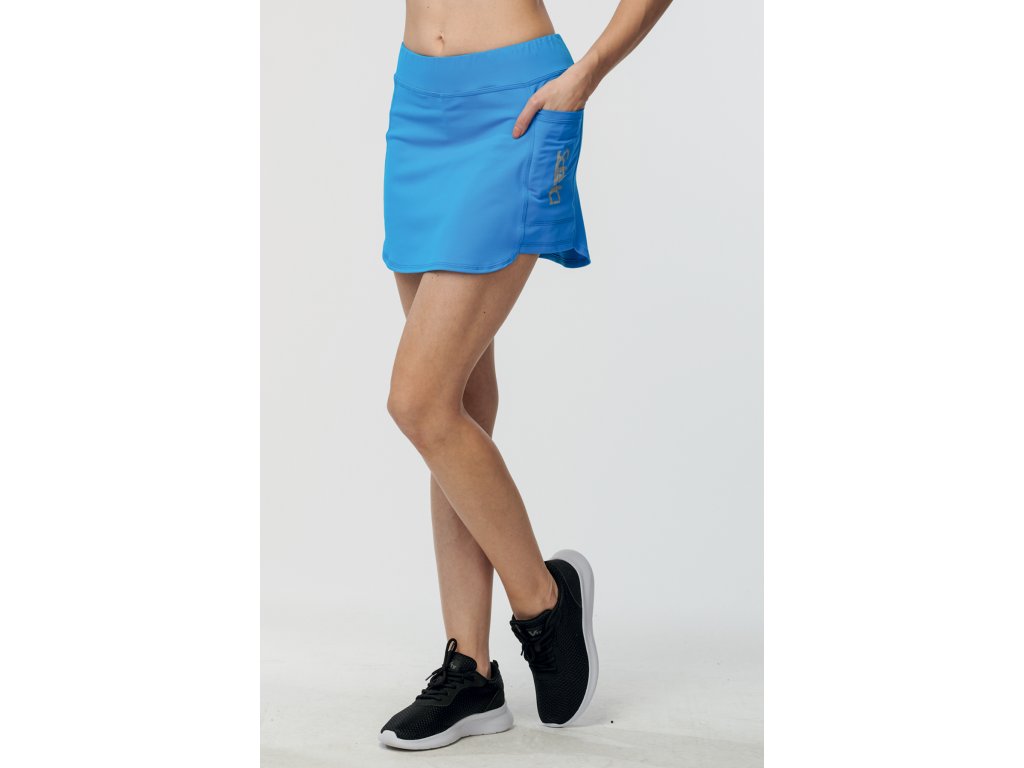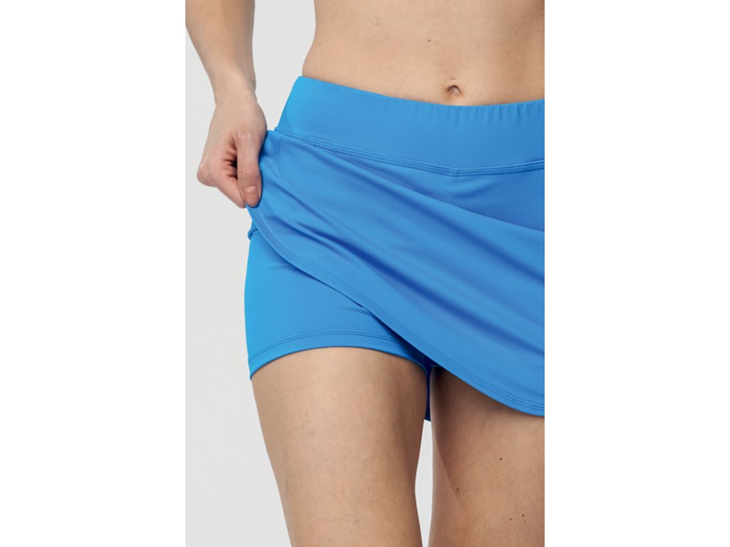 Kratší sportovní sukně s všitými kraťasy. Sukně má na bočním dílku kapsu s kontrastním potiskem a je vyrobená z funkčního materiálu Lomellina Nair v kombinaci polyamidu s elastanem. Materiál se vyznačuje měkkým obtahujícím efektem, je vysoce prodyšný a zajišťuje rychlý odvod potu od těla pro dokonalý komfort.