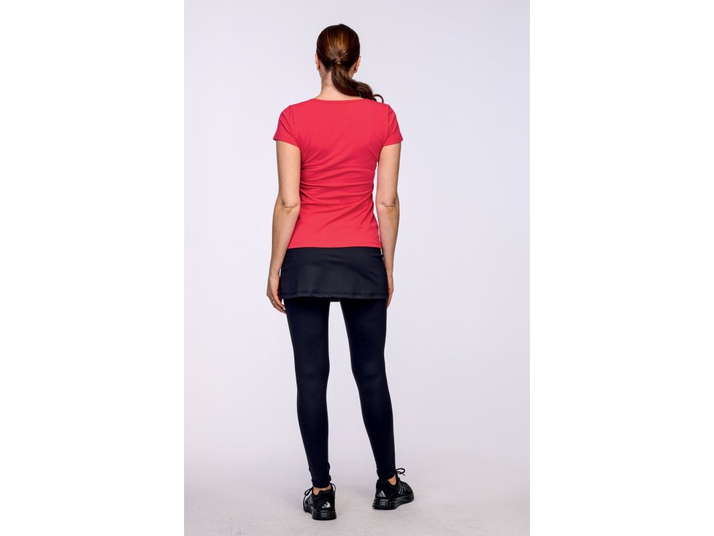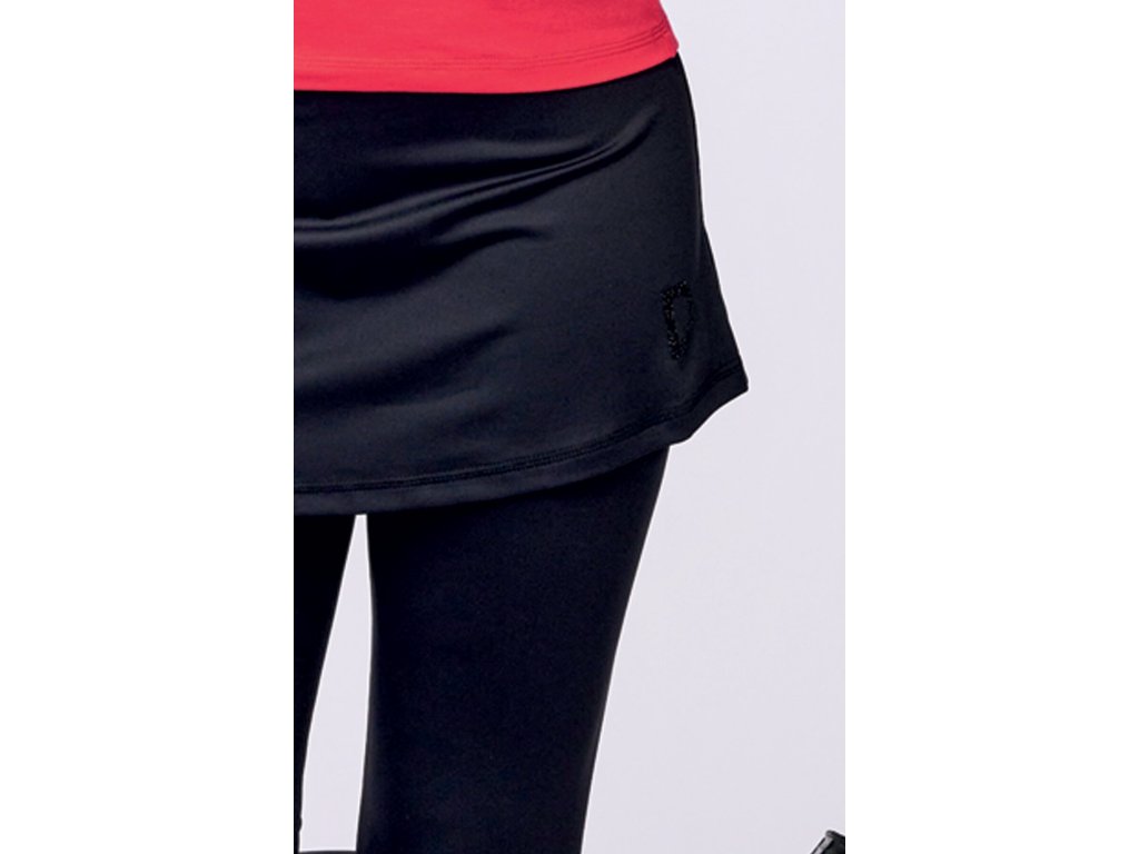 Upnuté sportovní dámské kalhoty s všitou sukní a lesklým potiskem. Kalhoty jsou vyrobeny z funkčního materiálu Lomellina Nair v kombinaci polyamidu s elastanem. Materiál se vyznačuje měkkým obtahujícím efektem, je vysoce prodyšný a zajišťuje rychlý odvod potu od těla pro dokonalý komfort při jakékoli sportovní aktivitě.