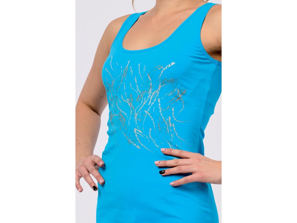 Přiléhavé dámské šaty sportovního typu. Mají širší ramínka a na předním díle je potisk. Šaty mají délku nad kolena. Jsou vyrobené z bavlněného materiálu.