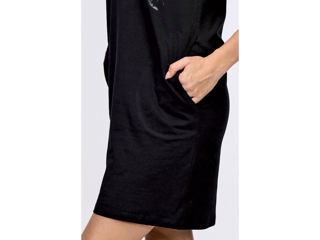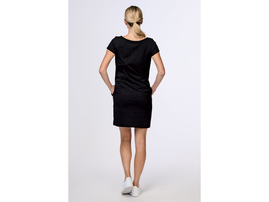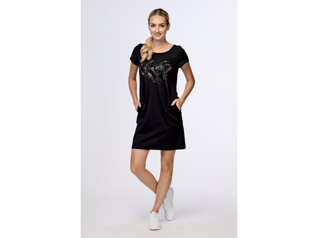 Dámské šaty volnějšího střihu s krátkým rukávem. Mají kapsy na bocích a na předním díle kontrastní potisk. Jsou v délce nad kolena. Šaty jsou vyrobené z příjemného bavlněného materiálu.