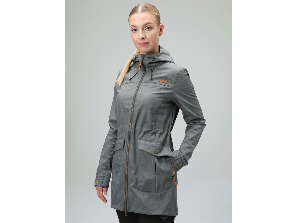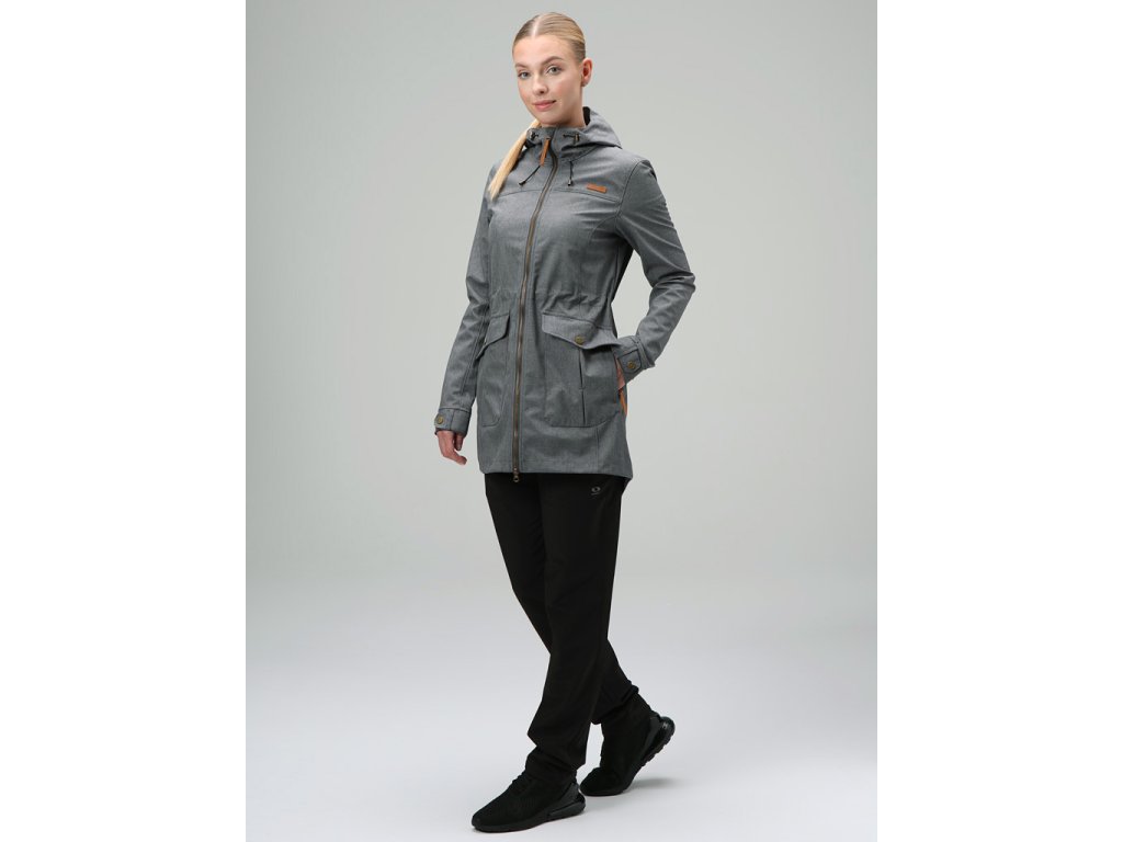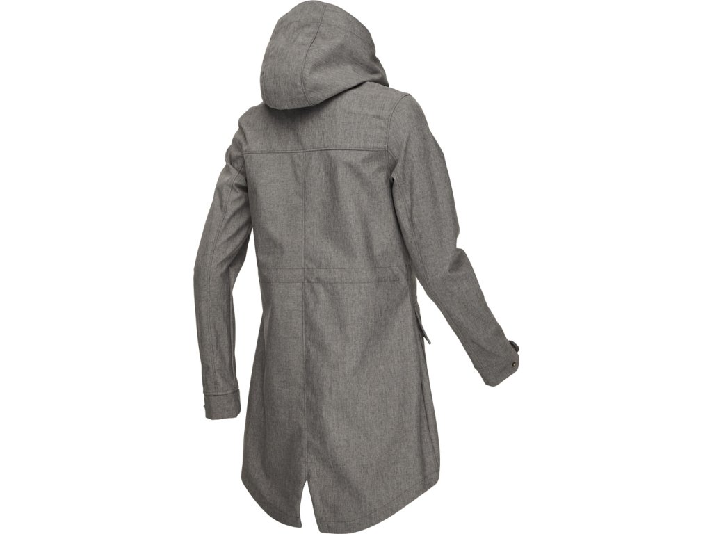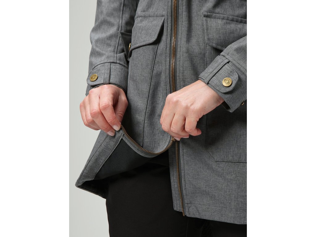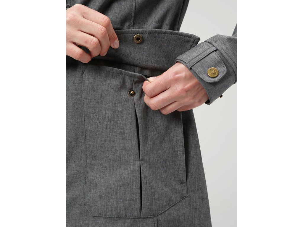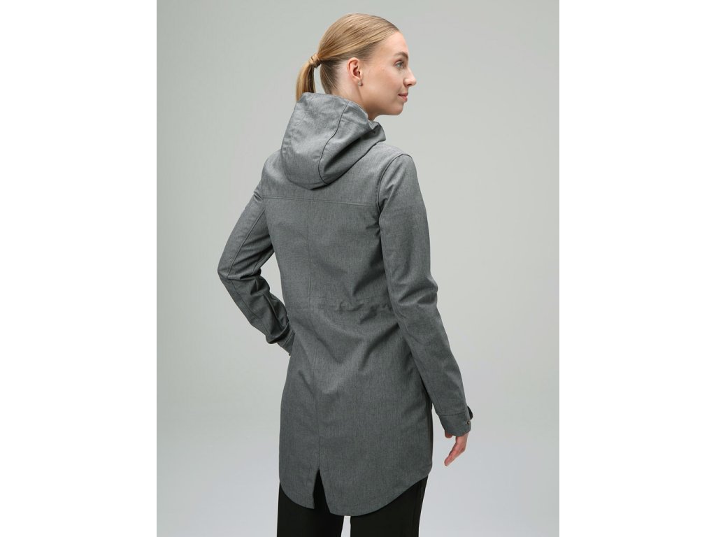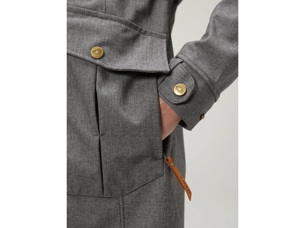 Kabát má klasický střih se spodním okrajem bez stahování a elegantním rozparkem v zadní části. Na vnitřní straně je vybaven tkaničkou pro možnost stáhnutí a zvýraznění v pase. Pomocí druků lze přizpůsobit podle potřeby také rukávy, nastavitelná je rovněž kapuce. Dvoucestný kostěný zip umožňuje rozepínání v obou směrech. Mobil, peněženku a další nezbytnosti pojmou bez problému dvě boční kapsy se zapínáním na druk.