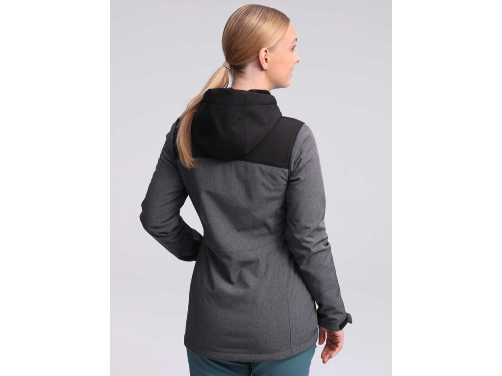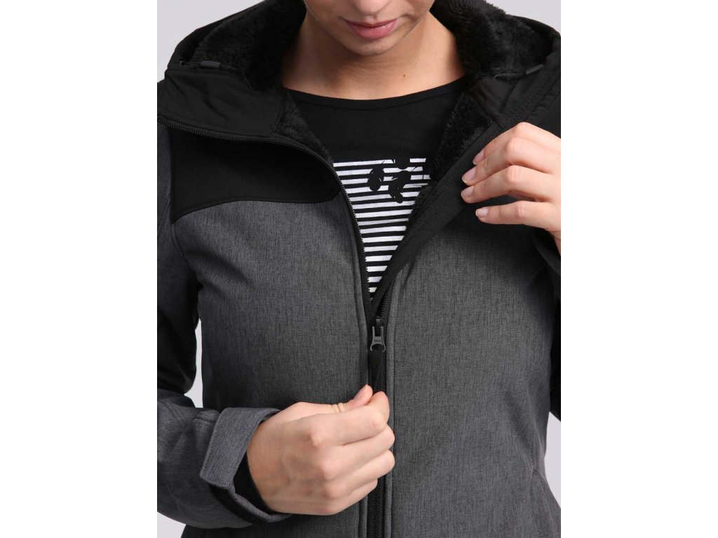 Zateplená dámská softshellová bunda Loap LUKA s kožíškem má vodní sloupec 5000 mm, prodyšnost 5000 g/m²/24 h a funkční membránu AQUA PRO. Spolehlivě odolá sněhu, dešti i ostrému větru. Nejenže chrání před nepřízní počasí, ale také efektivně odpařuje pot a přirozenou vlhkost od těla při náročnějším pohybu. Pružný a prodyšný svrchní materiál SOFTSHELL se snadno přizpůsobí tělu a rychle zahřeje díky kožíšku na vnitřní straně bundy. Tato žíhaná softshell bunda do pasu nemá podšívku a je ušita v klasickém střihu s mírně prodlouženým zadním dílem.