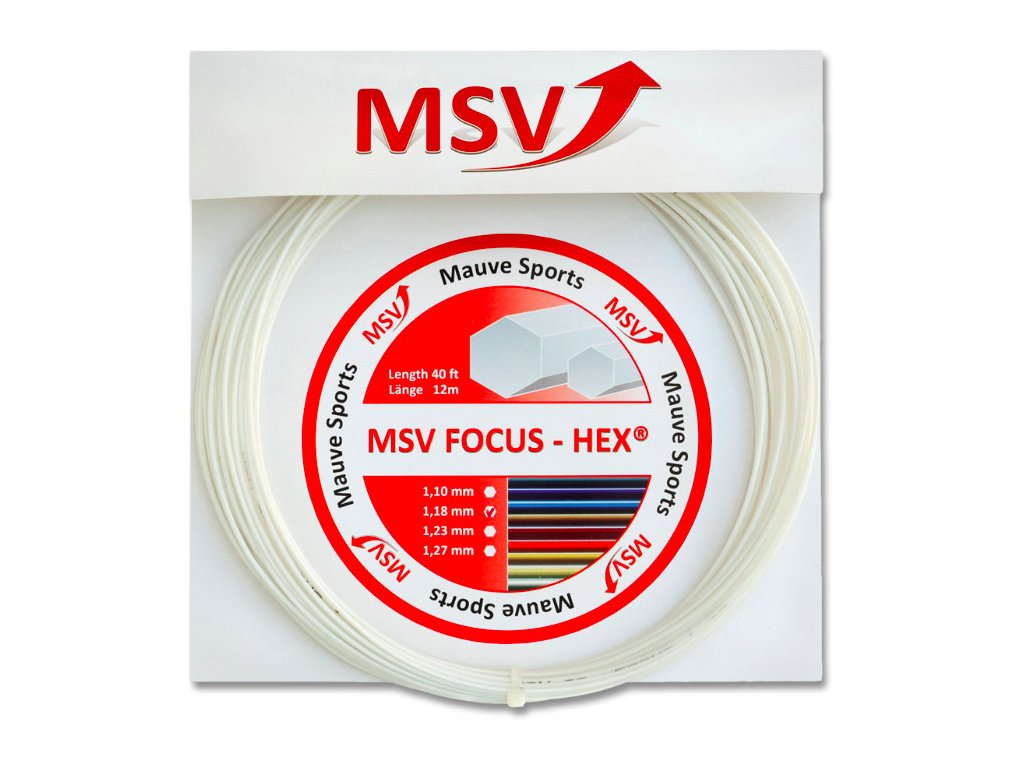 Novinka na českém trhu. Poly výplet roku 2007, ve všech vlastnostech nejlepší na německém Saitenforum.de. (Životnost, Síla, Kontrola, Cit, Komfort, Spin, Stabilita napětí). Celková spokojenost testujících hráčů 91% (39/43 testerů). CoPoly výplet nové generace, HEXagonální profil struny (šestiúhelník). Velmi dobrá trvanlivost strun. Výplet nabízí stálé napětí a dlouhodobý výkon. MSV Focus HEX ztrácí po 30-ti dnech a mnoha hodinách usilovné hry pouze 13% ze svého napětí. Velkou výhodou je potenciál pro spinové údery. Hráči ho popisují jako "nejlepší výplet na spinové údery", a to ve všech jeho průměrech. Hra s tímto výpletem je navíc velmi pohodlná.