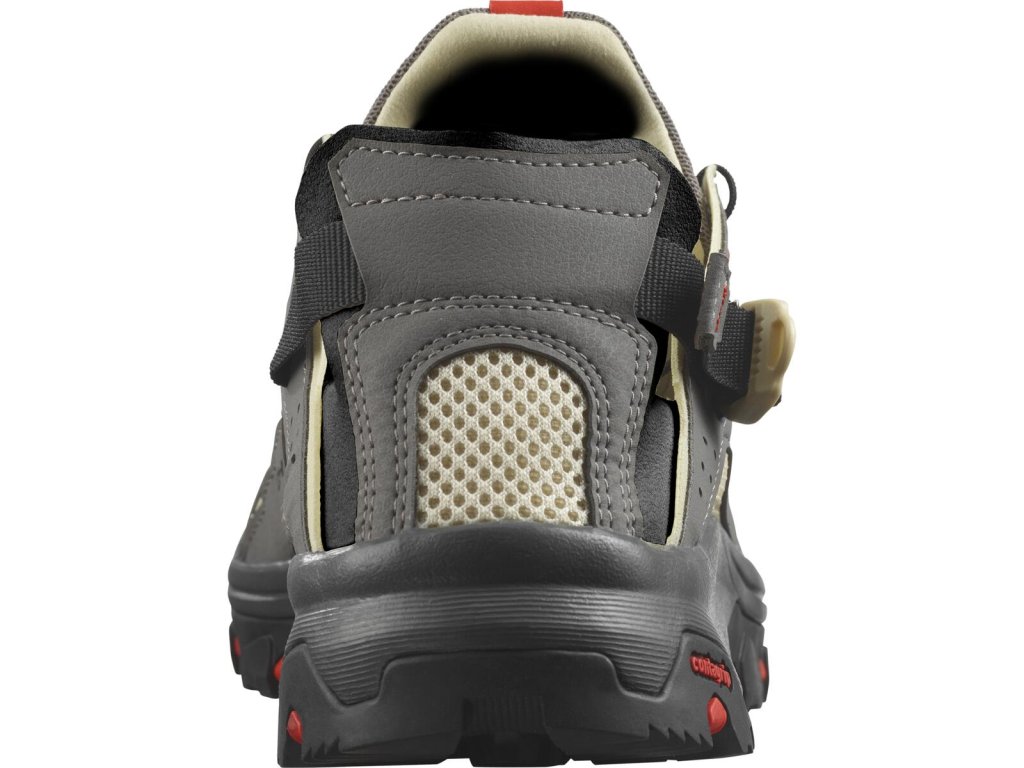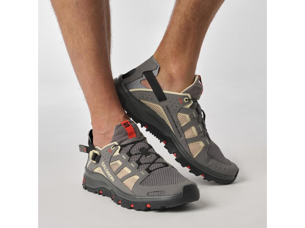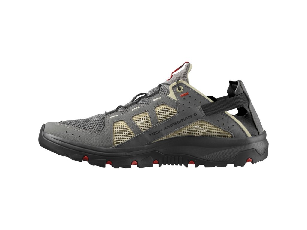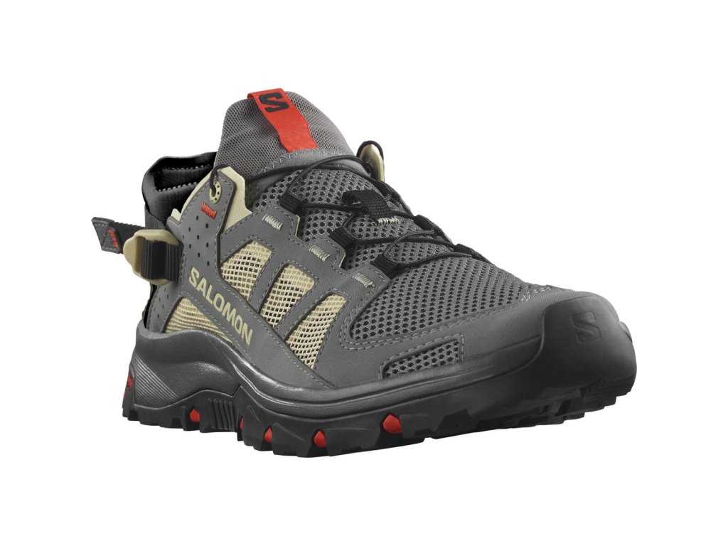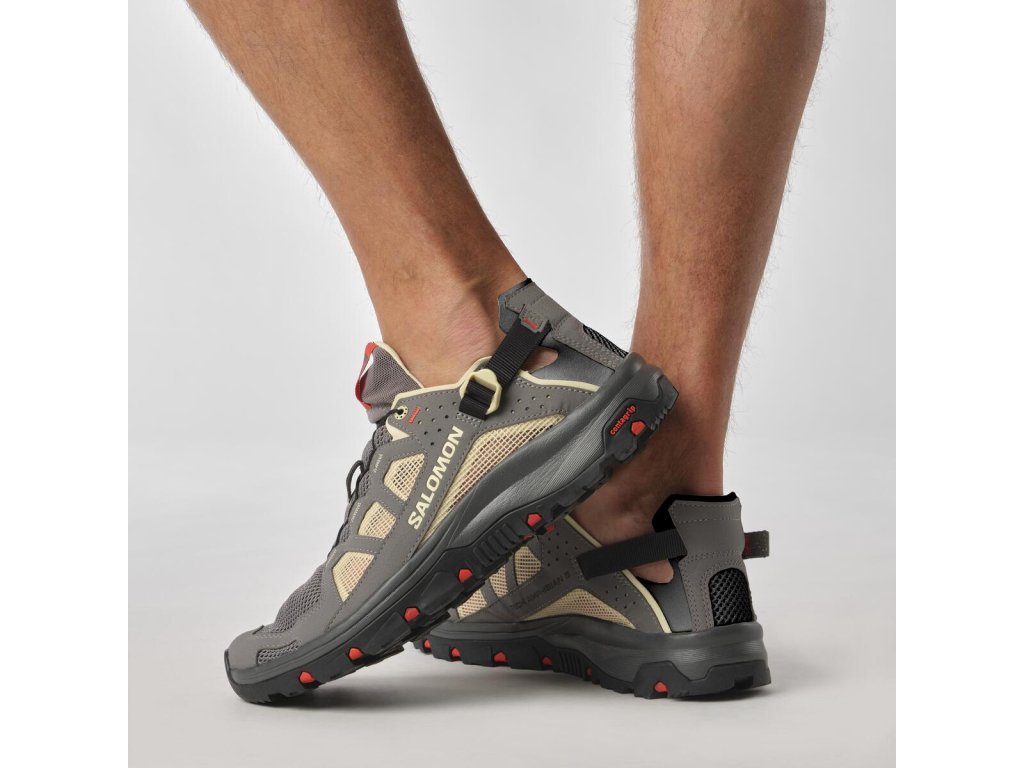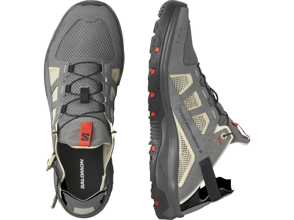 Legendární pánské sandály Salomon Techamphibian 5 v novém přepracování dostaly měkčí stélku a vylepšený jazyk. Nabídnou vám tak ještě větší pohodlí, ať už tyto univerzální sandály obujete kamkoliv. Svršek tvoří rychleschnoucí prodyšná síťovina s úpravou Anti-debris, která chrání před vniknutím nečistot a kamínků dovnitř obuvi a je také velmi odolná proti oděru. Výbornou přilnavost i ve vodě na mokrých kamenech zajistí podešev Contagrip® FD se speciálním vzorkem. O maximální tlumení nárazů při došlapu a anatomickou podporu nohy se stará EVA pěna, z níž je vyroben také jazyk, což přináší lepší prodyšnost a především eliminuje odřeniny. Technologie SensiFit™ pevně obepne chodidlo a nabízí tak lepší stabilitu nohy. Nechybí rychlošněrování Quicklace™ s kapsičkou na uschování šňůrky a pohodlné nastavení přímo na vaši nohu díky pásku v patní části. I s ochranou špičky tyto pohodlné univerzální sandály váží pouhých 618 gramů.