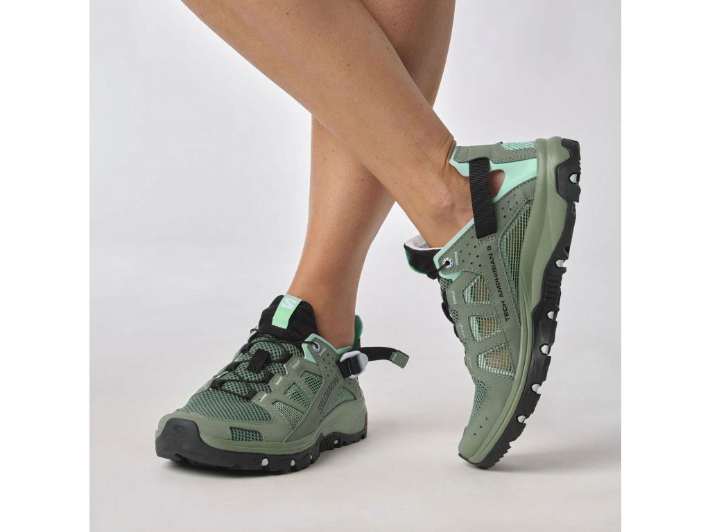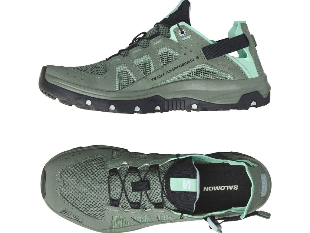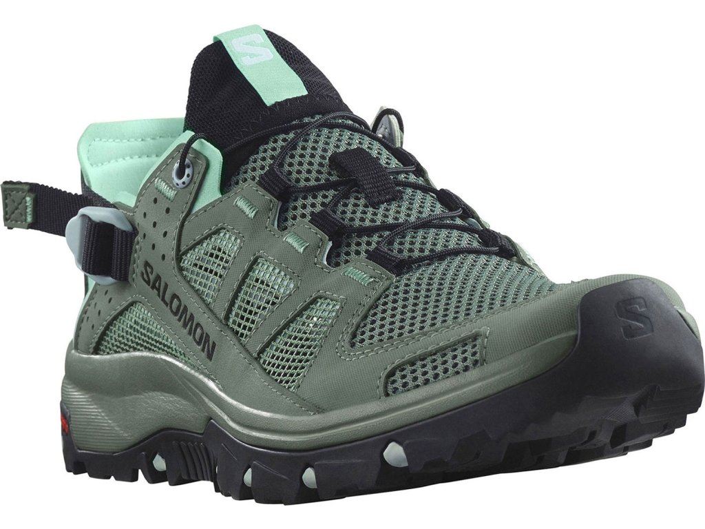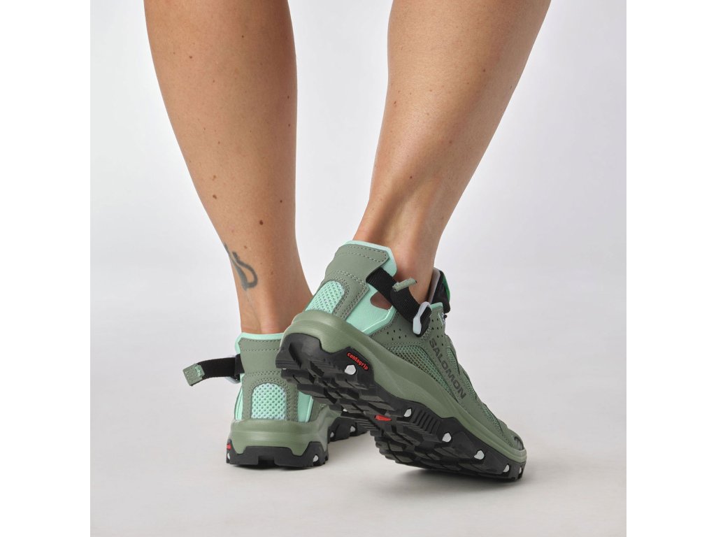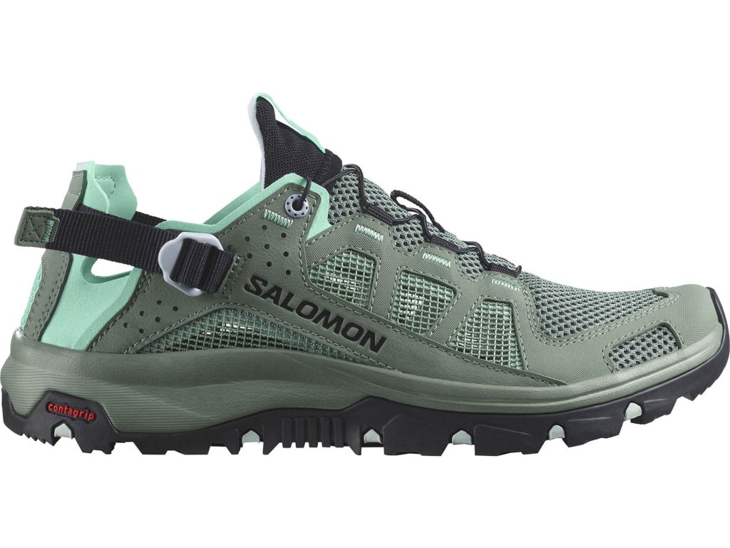 Legendární dámské sandály Salomon Techamphibian 5 v novém přepracování dostaly měkčí stélku a vylepšený jazyk. Nabídnou vám tak ještě větší pohodlí, ať už tyto univerzální sandály obujete kamkoliv. Svršek tvoří rychleschnoucí prodyšná síťovina s úpravou Anti-debris, která chrání před vniknutím nečistot a kamínků dovnitř obuvi a je také velmi odolná proti oděru. Výbornou přilnavost i ve vodě na mokrých kamenech zajistí podešev Contagrip® FD se speciálním vzorkem. O maximální tlumení nárazů při došlapu a anatomickou podporu nohy se stará EVA pěna, z níž je vyroben také jazyk, což přináší lepší prodyšnost a především eliminuje odřeniny. Technologie SensiFit™ pevně obepne chodidlo a nabízí tak lepší stabilitu nohy. Nechybí rychlošněrování Quicklace™ s kapsičkou na uschování šňůrky a pohodlné nastavení přímo na vaši nohu díky pásku v patní části. I s ochranou špičky tyto pohodlné univerzální sandály váží pouhých 618 gramů.
