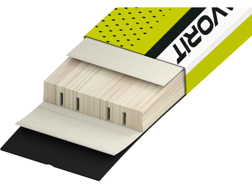 Woodcore - Dřevěné jádro, které se skládá z mnoha spojených lamel výběrového dřeva pro zajištění stability jádra. U běžeckých lyží navíc se vzduchovými kanálky pro odlehčení.