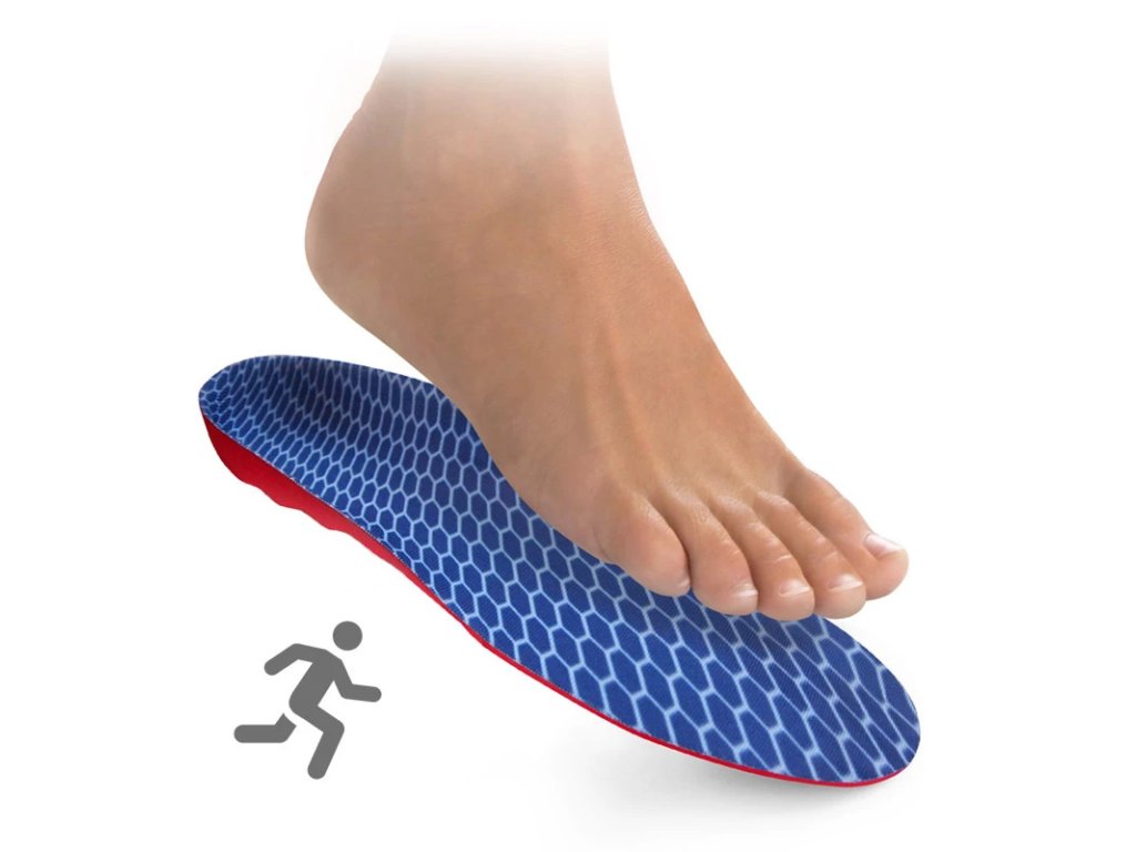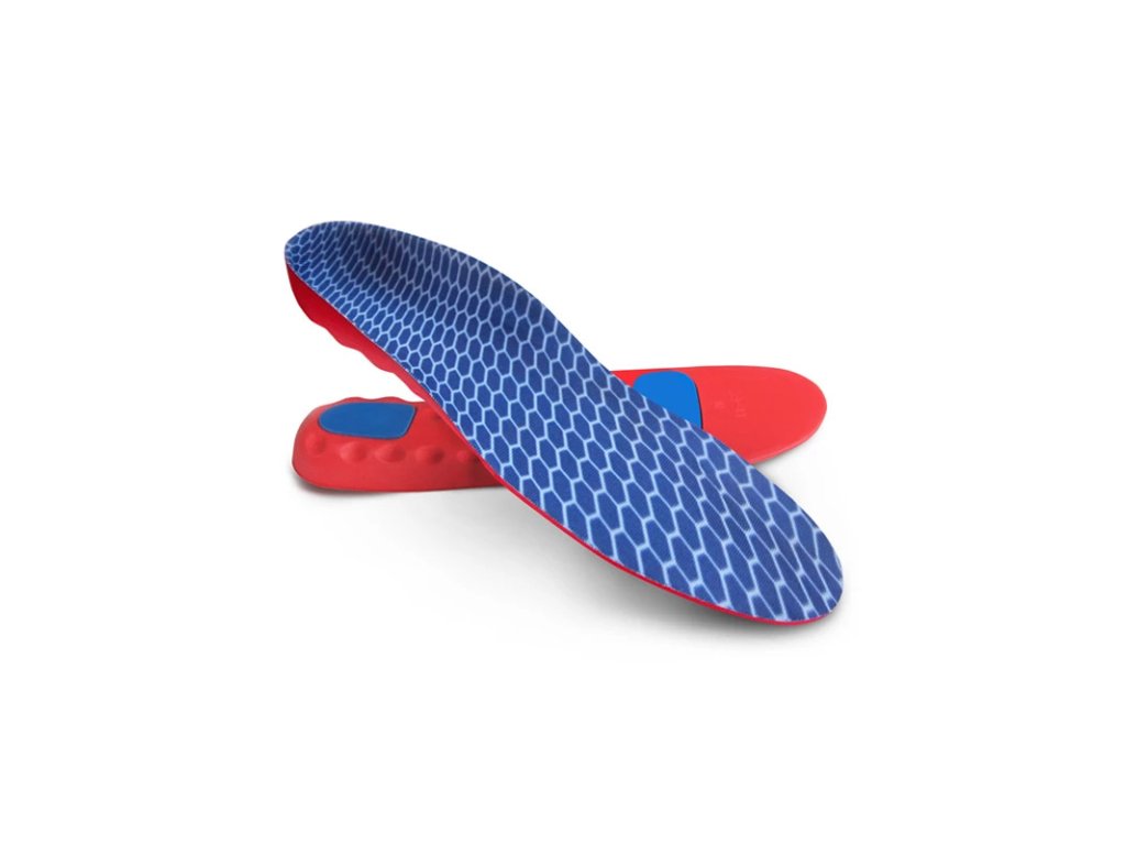Antišokový materiál pod patou a klouby prstů tlumí nárazy a chrání citlivé části nohy. Vrchní část vložky je potažena textilem.