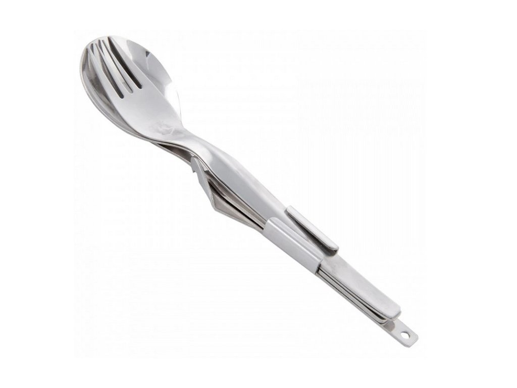 Turistický příbor. Lžíce, vidlička, nůž a otvírák na konzervy.