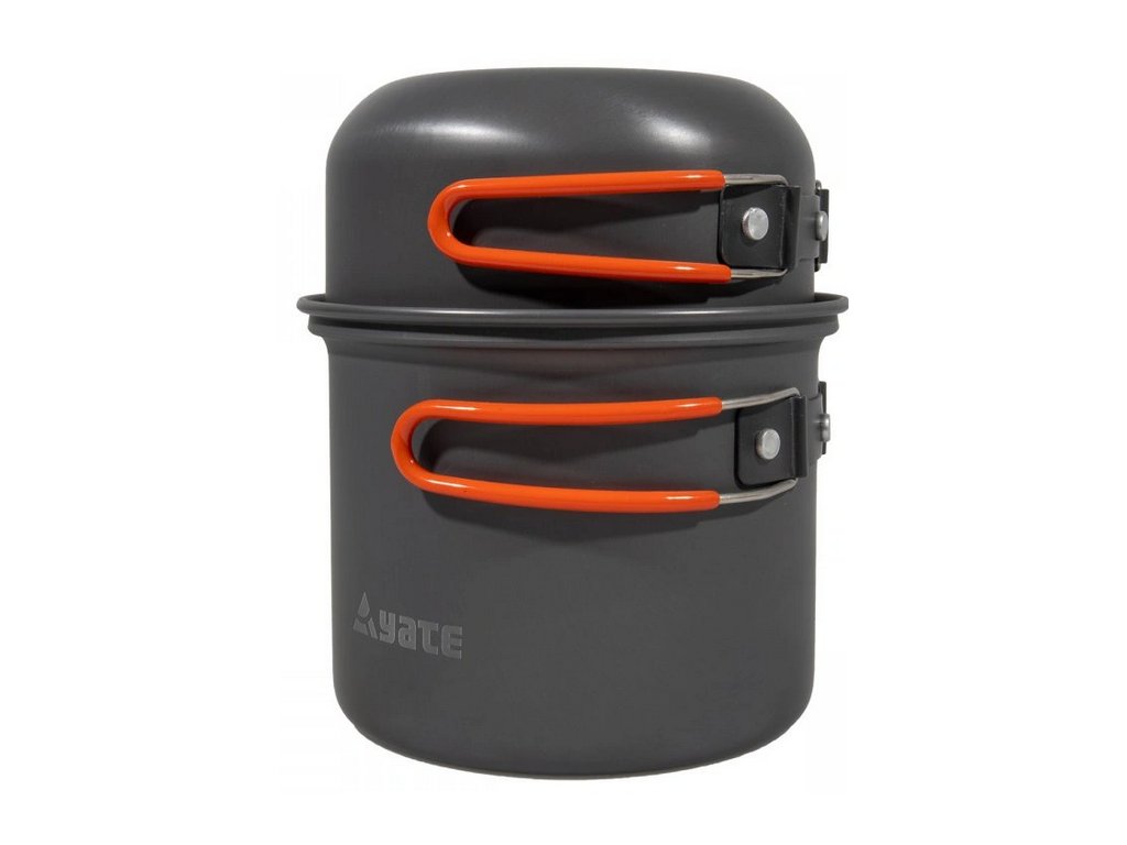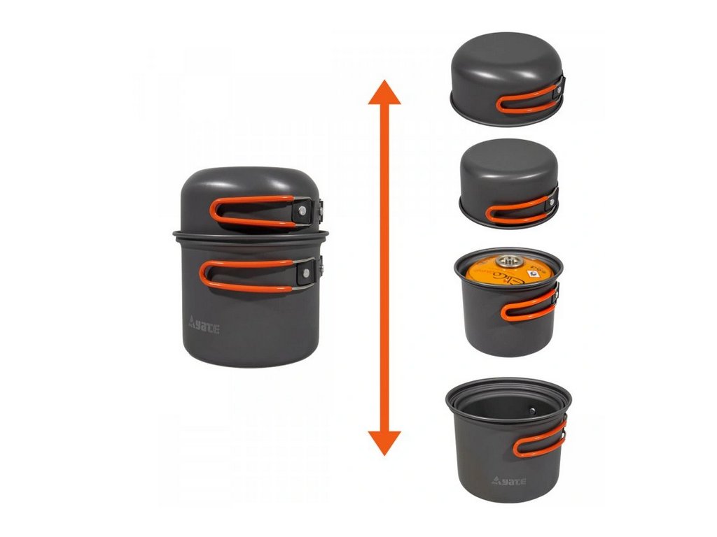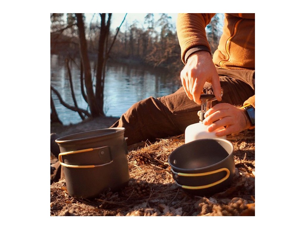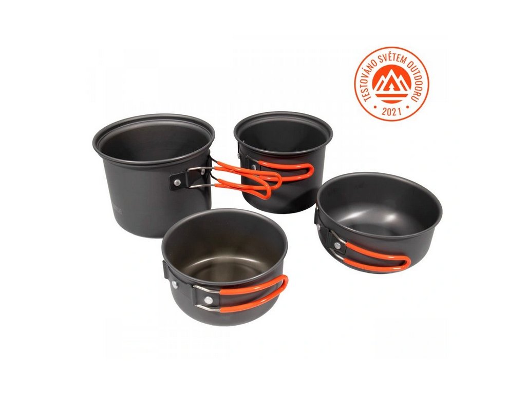 Sada nádobí pro 3-4 osoby z eloxovaného potravinářského hliníku, který je odolný proti oděru. Držadla jsou chráněna silikonem proti popálení a jsou příjemná do ruky. Dodáváno včetně přepravního obalu. Velmi lehká a kompaktní. Do hrnce se pohodlně vejde kartuše na plyn (do malého hrnce 300 g, do velkého 300 i 500g) a vařič.