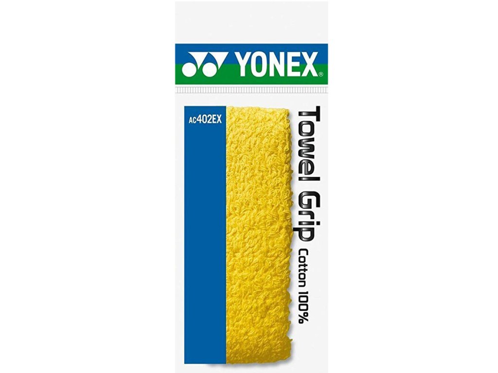 Yonex Towel Grip AC402 je vytvořen ze 100% bavlny s délkou 66 cm, šířkou 3,2 cm a s tloušťkou 1,35 mm. Towel Grip AC402-2EX je schopen účinně absorbovat vlhkost z Vašich potících se rukou a pomáhá předcházet nežádoucímu vyklouznutí rakety. Vyměnit omotávku je snadné, proto si můžete vždy dovolit suchý a pohodlný grip.
